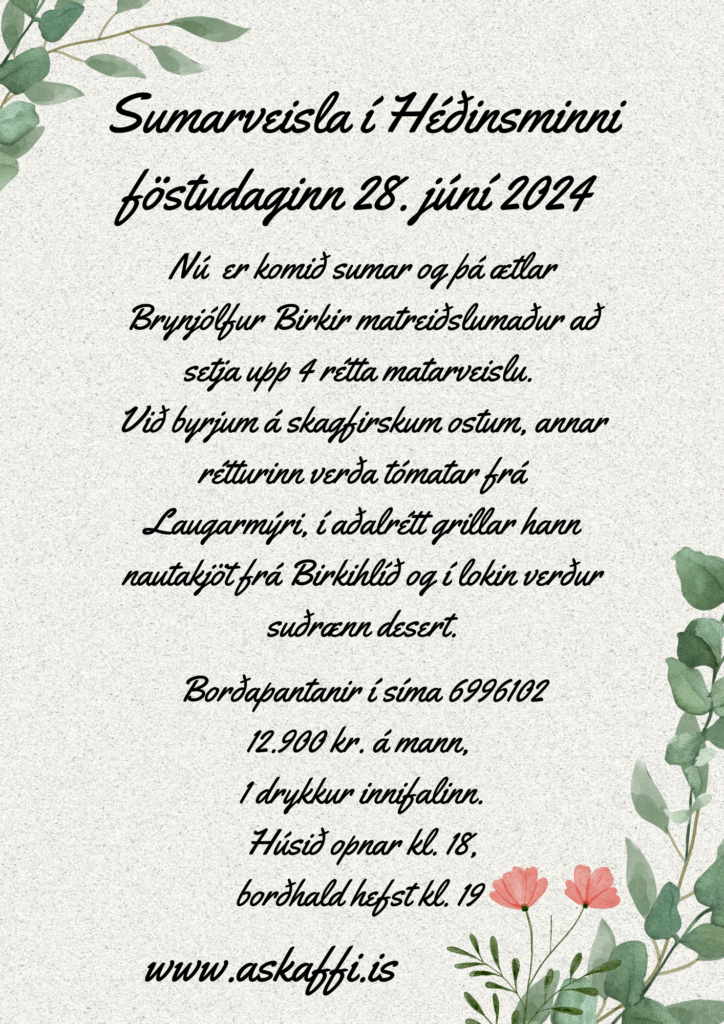 Opið 1.sept. – 8.sept. frá kl. 15-18 alla dagana í félagsheimilinu Héðinsminni Skagafirði. Allskonar varningur til sölu. Endilega koma við og kíkja á hvað væri hægt að nota áfram og nýta betur. Það verður líka hægt að njóta þess að setjast niður og fá sér kaffi og tertusneið eða 4 smábita á 1.650 kr. Ef þú hefur áhuga á að vera með söluvörur endilega hafðu samband við Herdísi í síma 6996102, leiga fyrir hvert borð 2.500 kr. Verið velkomin í Héðinsminni.